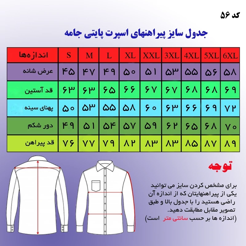 سایز:S-M-L-XL-XXL-3XL-4XL-5XL-6XL برای انتخاب سایز مورد نظر خود حتما به جدول سایز موجود در آلبوم عکسها توجه فرمایید.