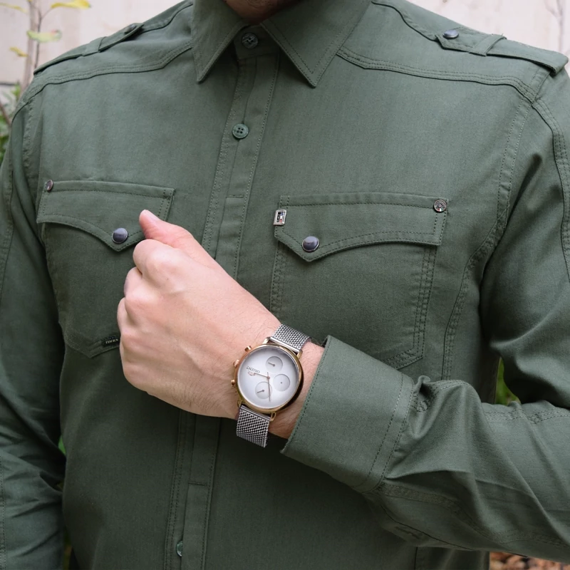 پیراهن جین مردانه آستین بلند اسپرت برای افراد درشت اندام با طرح ساده و رنگ سبز تیره نازک و لطیف با الگوی اختصاصی شرکت پایتیجامه طراحی شده، بهصورت کاملاً صنعتی دوخته شده و با حساسیت و ظرافت شخصیدوزی تهیه گردیده است.